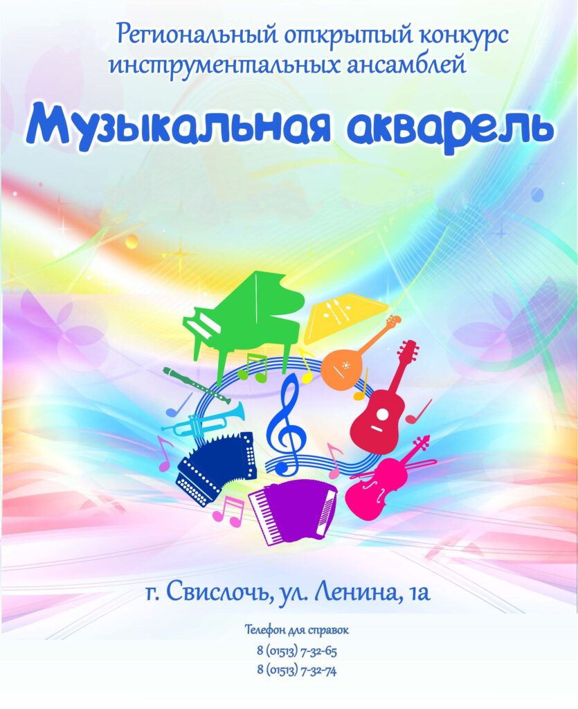 Приглашаем детские инструментальные творческие коллективы на VII региональный открытый конкурс инструментальных ансамблей «Музыкальная акварель». Конкурс проводиться в трех номинациях: «Однородный ансамбль», «Смешанный ансамбль», ансамбль «Учитель-ученик». Вдохновенным исполнением конкурсной программы мы вместе создадим красочную палитру Музыкальной акварели!