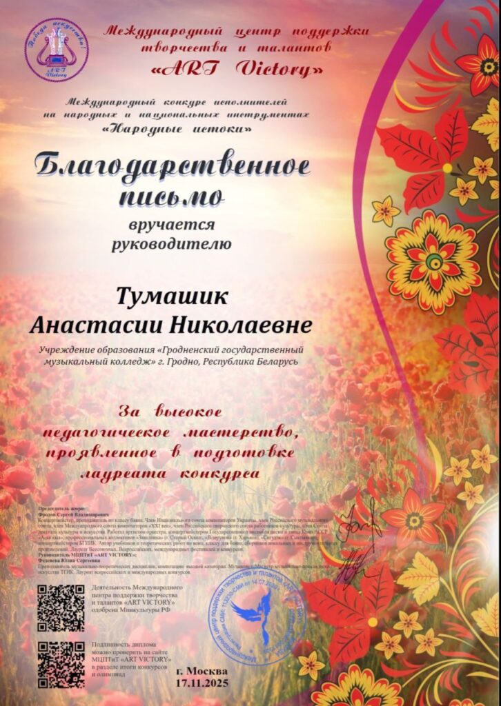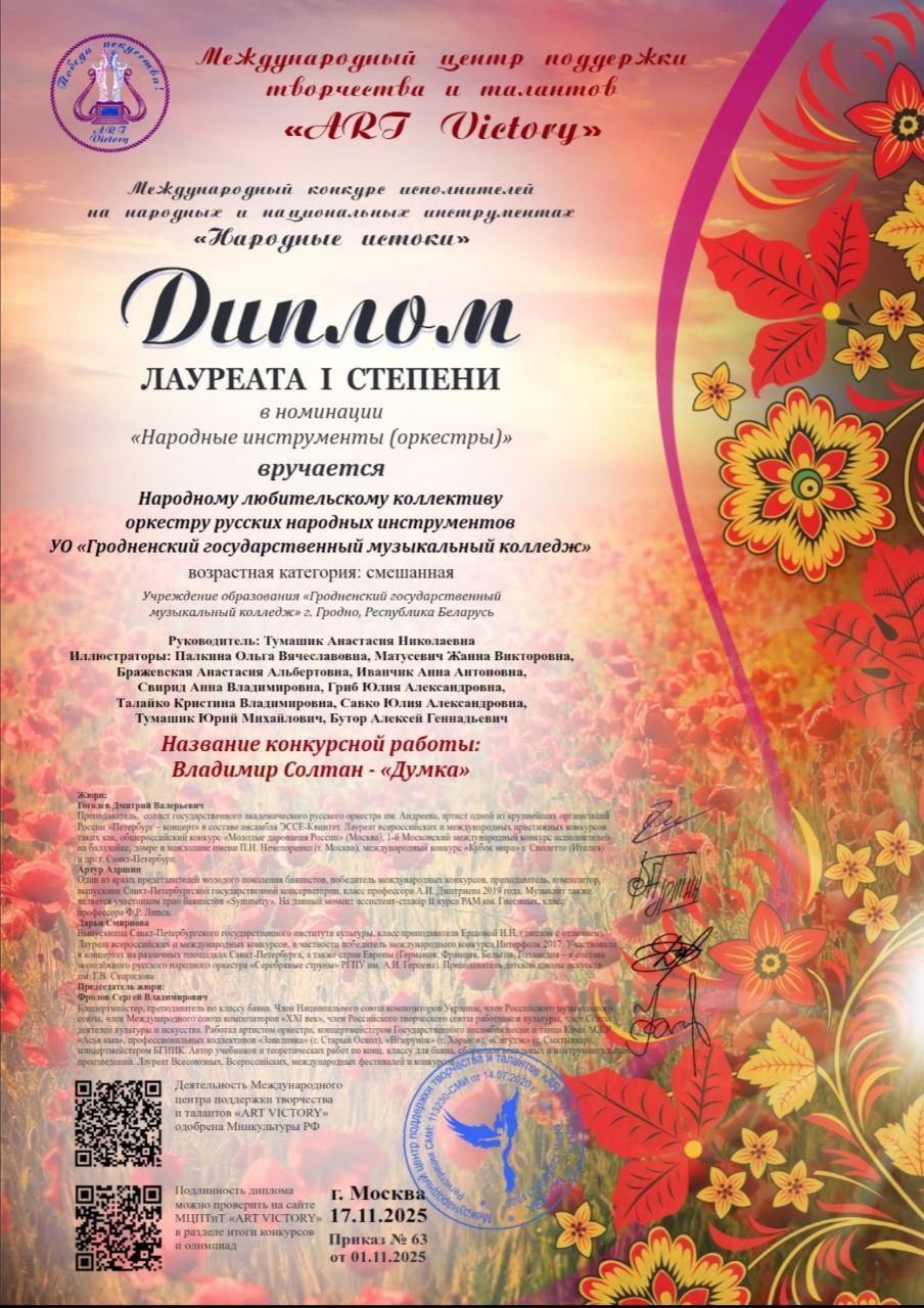 Поздравляем народный оркестр русских народных инструментов (руководитель Анастасия Николаевна Тумашик) с победой на Международном конкурсе исполнителей на национальных инструментах «Народные истоки», г. Москва. Среди более чем шести тысяч участников коллектив награжден дипломом лауреата 1 степени за исполнение одного из самых мелодичных произведений белорусского композитора Владимира Солтана «Думка».