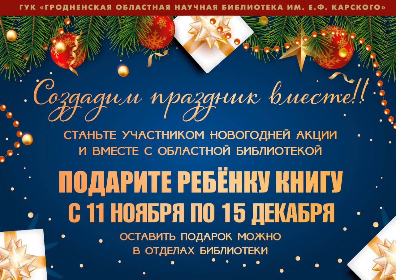 В преддверии республиканской акции «Наши дети» с 11 ноября по 15 декабря 2025 года в Гродненской областной научной библиотеке имени Е.Ф. Карского пройдёт благотворительная акция!